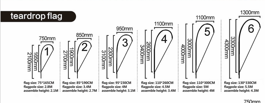 | Flag Size(cm) | 75x165 | 85x190 | 95x230 | 110x260 | 110x300 | 130x330 |